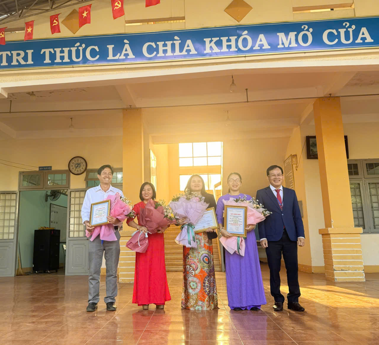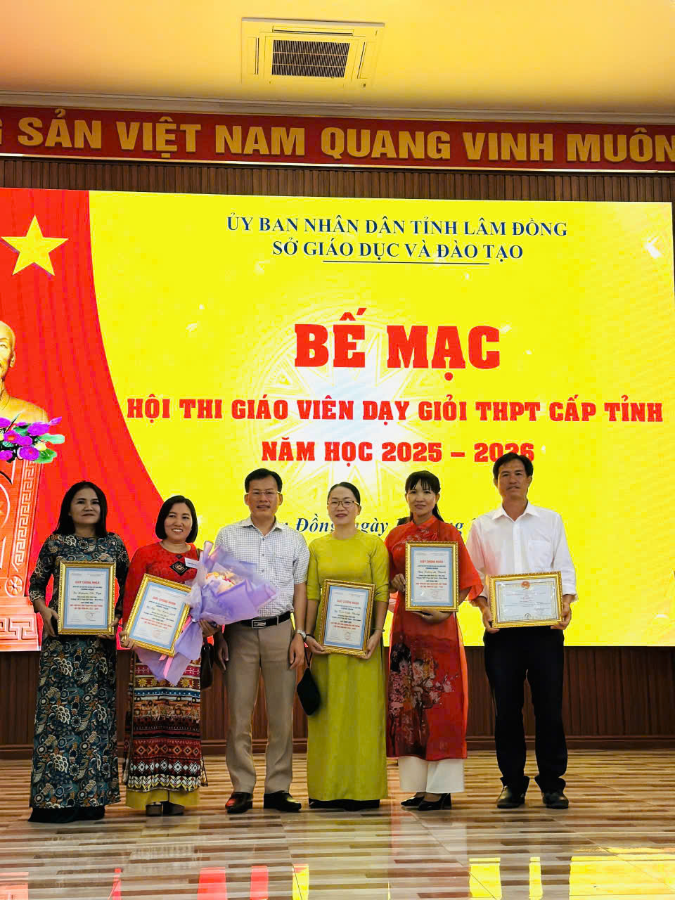 Sáng nay, trong tiết chào cờ đầu tuần ngày 16/03/2026 nhà trường tổ chức trao giấy chứng nhận, giấy khen và tặng hoa chúc mừng quý thầy cô đã đạt thành tích xuất sắc tại Hội thi Giáo viên dạy giỏi cấp tỉnh năm học 2025-2026. Nhằm nâng cao chất lượng giáo dục, thúc đẩy phong trào thi đua “Dạy tốt – Học tốt” và khuyến khích giáo viên đổi mới phương pháp giảng dạy. Sở Giáo dục và Đào tạo đã tổ chức Hội thi Giáo viên dạy giỏi cấp tỉnh năm học 2025 – 2026 (từ ngày 09/3/2026 đến 13/3/2026) tại các trường THPT trên địa bàn Phường Gia Nghĩa, tỉnh Lâm Đồng. Đây là sân chơi chuyên môn ý nghĩa, tạo điều kiện để các thầy cô giáo thể hiện năng lực sư phạm, trình độ chuyên môn nghiệp vụ cũng chia sẻ kinh nghiệm giảng dạy và học hỏi lẫn nhau để phát triển bản thân.